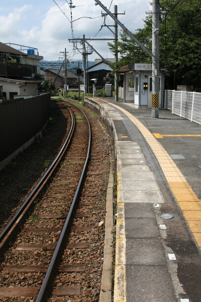 広小路駅は急カーブに設けられたホーム。大きな桜の木があり、開花シーズンには列車とともに撮影スポットになります。