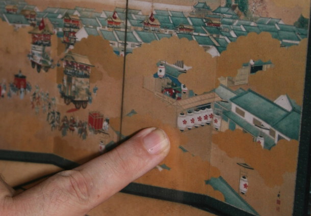 農人町は9町と異なり、庄屋が収めていた地区。申し出は認められず、代わりにちょうちんで飾った屋根付きの柱の門で、だんじりを迎えることにした。昭和初期に描かれたとみられる上野天神祭礼図のびょうぶにも出てくる。「戦前まで設けられ、下をだんじりがくぐっていた」