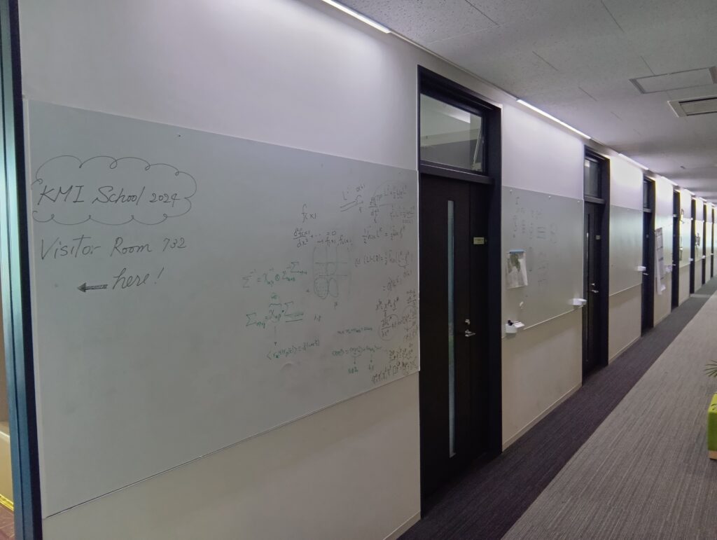 そんな中、直感的に惹かれたのが「素粒子宇宙起源研究所」でした。思い切って建物を訪ねてみると、想像以上の世界が広がっていました。廊下の両側にある部屋の壁には、びっしりと数式や図形がペンで書かれていました。